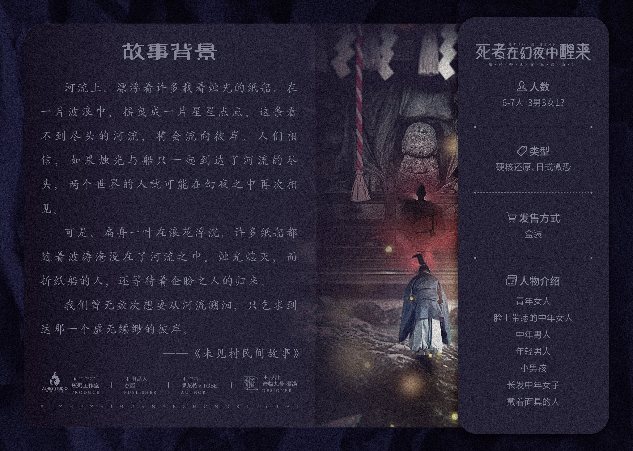 此部作品为阴阳师山背秋彦系列作品的番外作品,此系列作品共包含三部:《七月十三日》、《死者在幻夜中醒来》、《作者不详》)