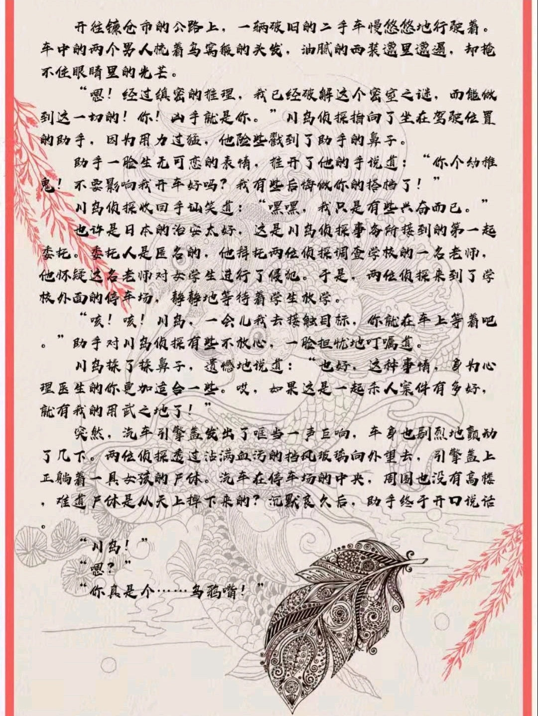 川岛揉了揉鼻子,遗憾地说道:"也好,这种事情,身为心理医生的你更加适合一些。哎,如果这是一起杀人案件有多好,就有我的用武之地了!”