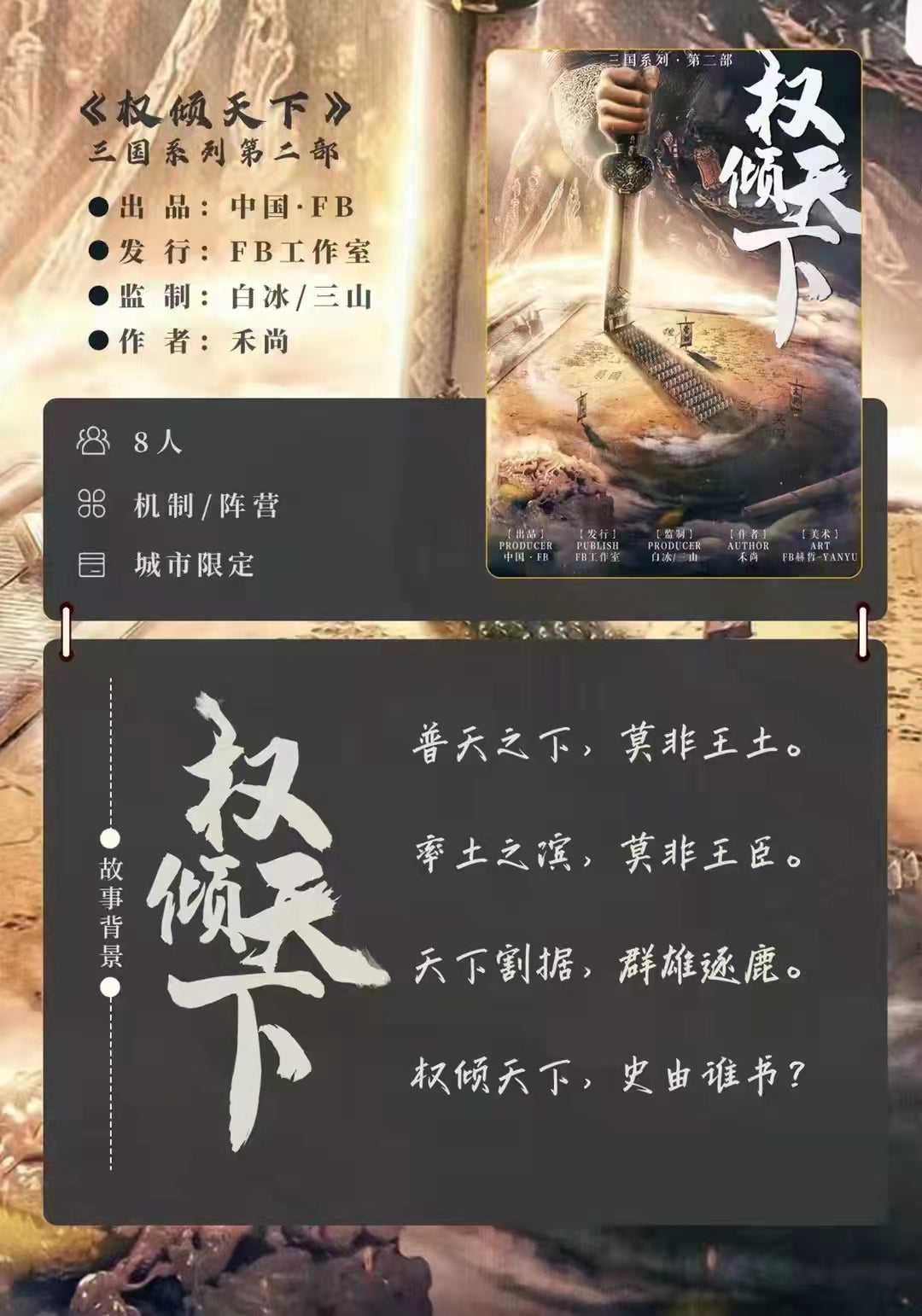 玩家在游戏中的所有努力在最终阶段都能兑现,大脑在连续作战7个小时后仍能奋力一搏,所有玩家都能参与到一个注定荡气回肠的结局。各家既可组队厮杀,又可各自为战,胜者站上乱世之巅,统一三国。