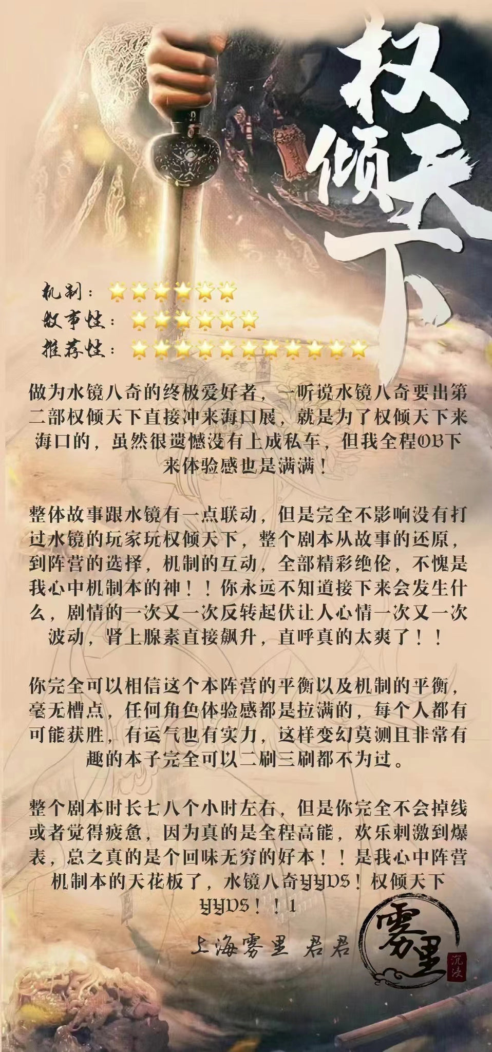 权倾天下结构清晰,每一幕的规则和机制都各有千秋。因为剧本是一个长篇巨制,为了确保合理的脑力分配,推理阶段相对友好。阵营本的精髓在于公聊与私聊的配合,每位角色的技能使得玩家会自然而然地拉开队形,划分阵营,没有一位玩家是边缘或陪跑人物,玩家需要在推理阶段不只关注于自己的任务与线索本身,还要思考各位角色之间的潜在关系,这是阵营以及使用技能最关键的判断依据。