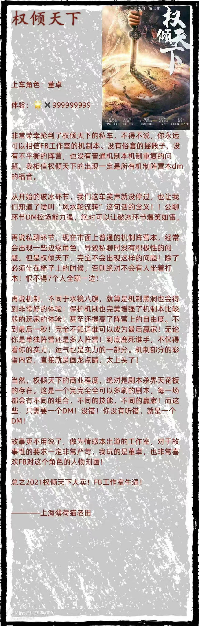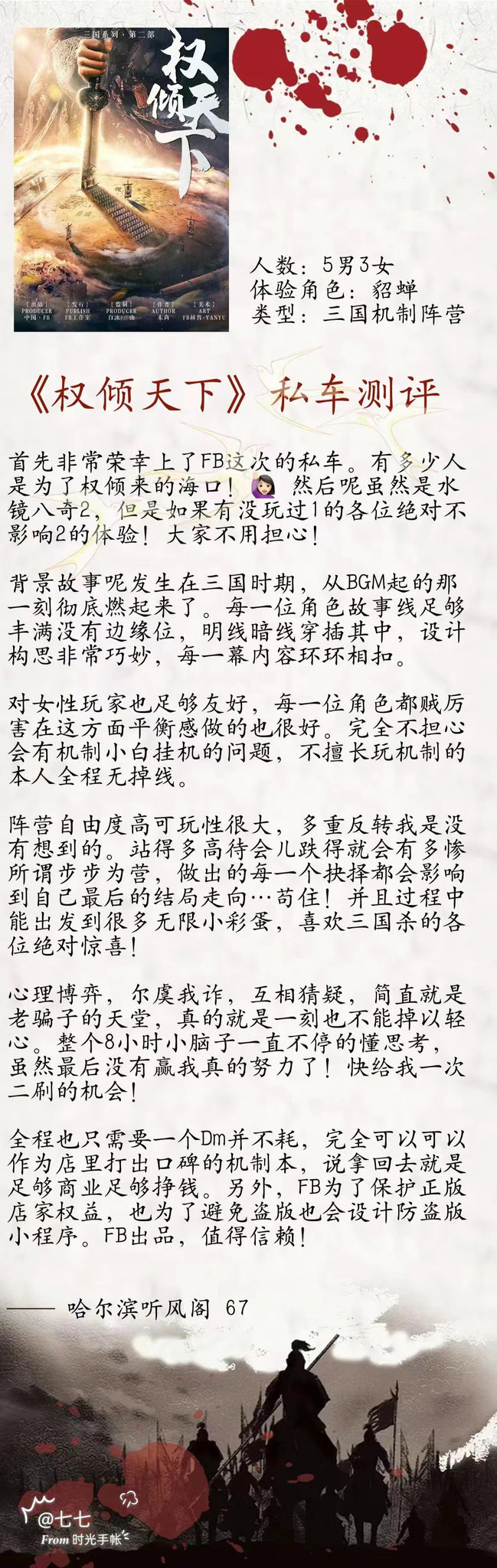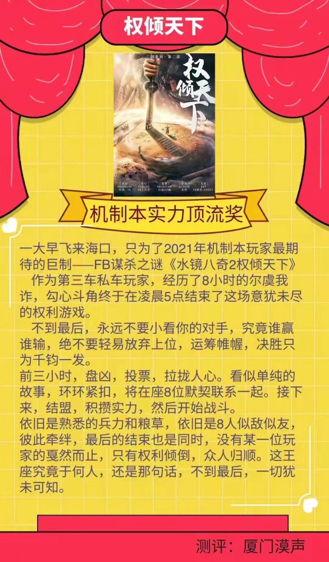 这个机制本很大程度上仰赖于DM对于规则的熟悉程度,Allen是FanC的金牌DM,对组织剧本做出了难以想象的准备,无论是串联剧情,调动气氛,以及最终游戏的积分统计方面都无可挑剔。在游戏层面上最后有一个圆满的收尾,DM的精密布局不可或缺。